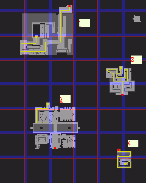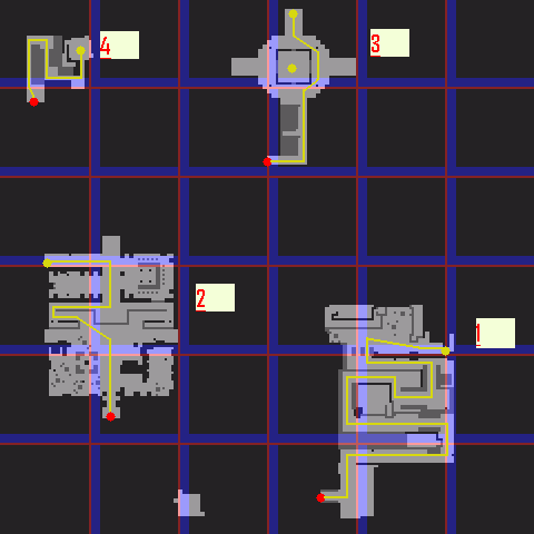Os circulos em vermelho demarca o ponto de partida em cada sala, os traços em amarelo é o caminho para emp junto com os circulos da mesma cor.